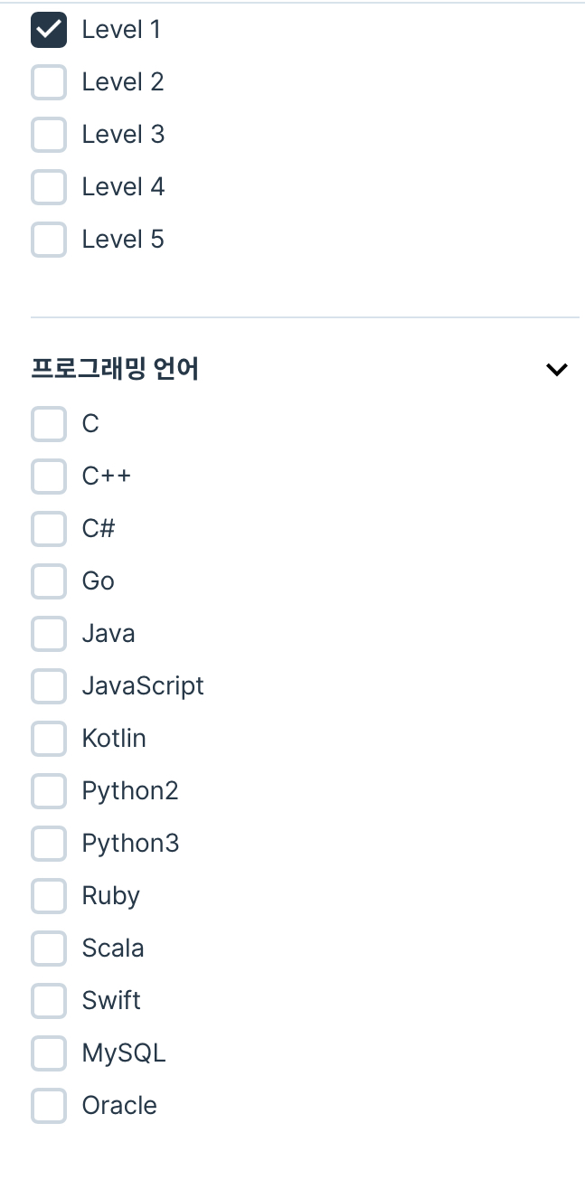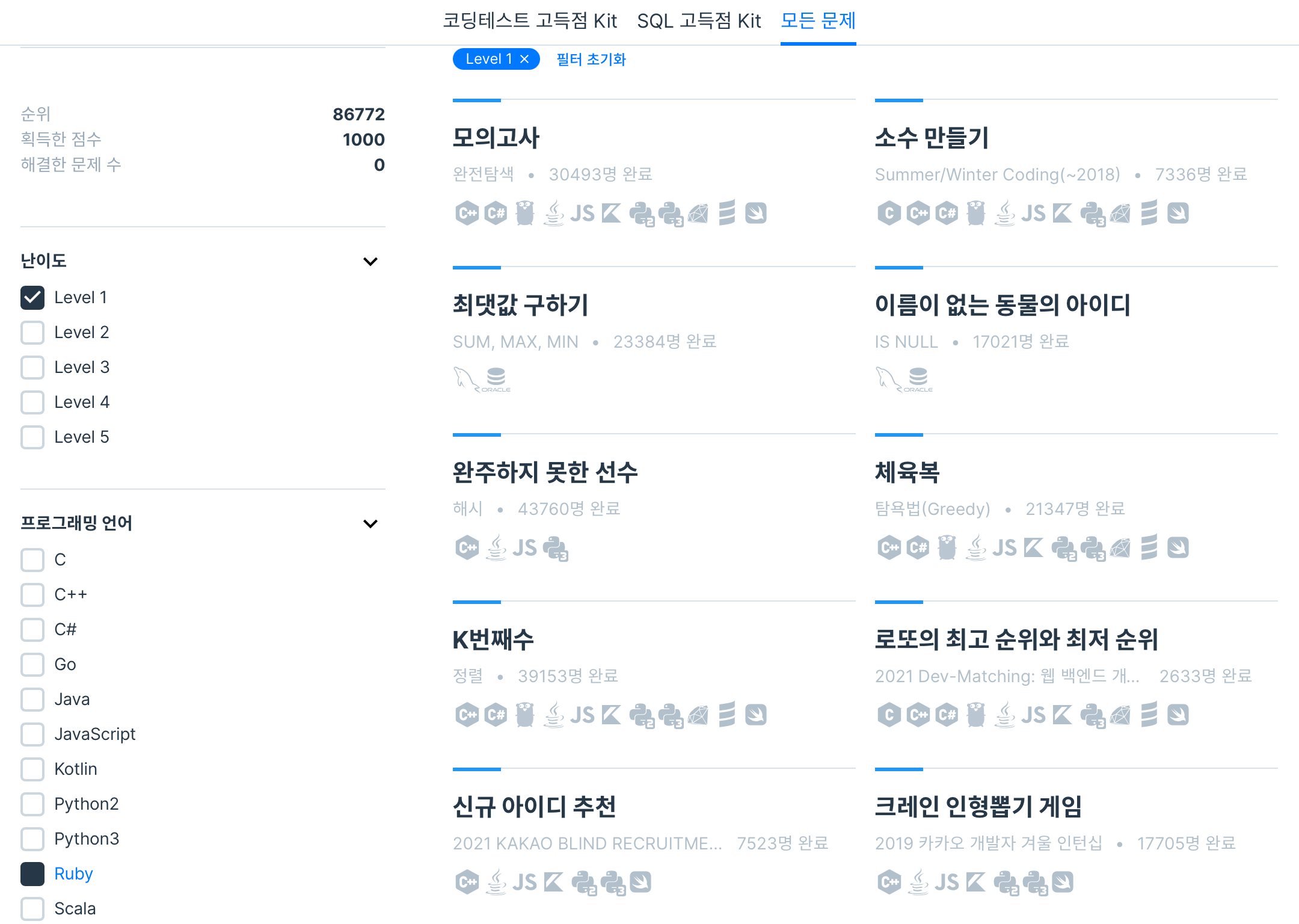 이 사이트의 장점 중 하나는 문제 난이도에 따라 레벨이 1~5로 나눠져 있고 본인이 공부하고자 하는 언어를 선택하여 그에 해당되는 문제만 볼 수 있다는 것입니다.